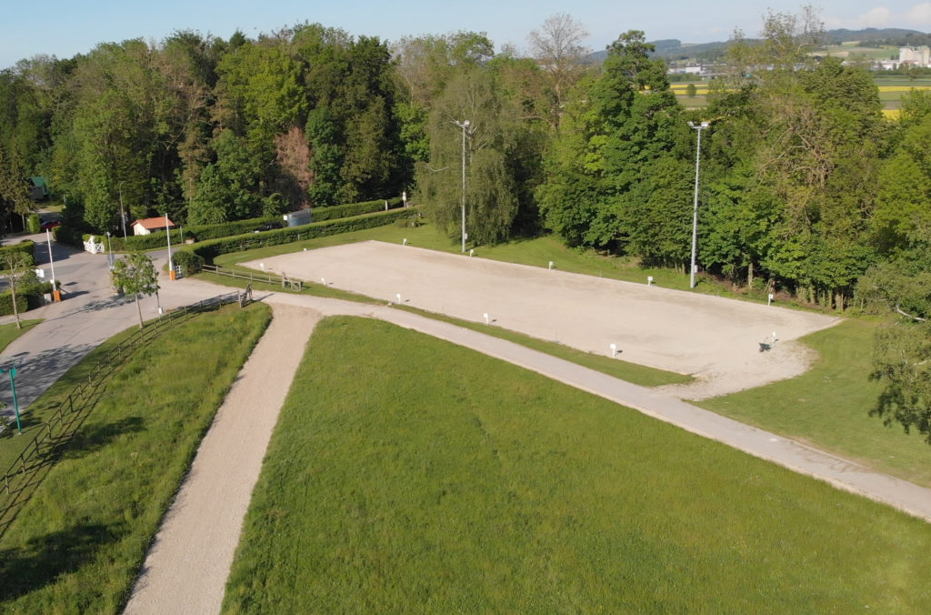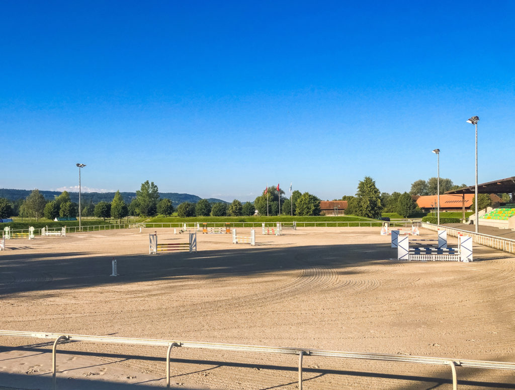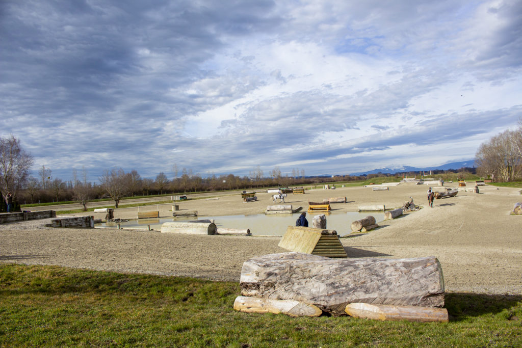 75’000m² (dont 22’000m² en sable fibré), 30 obstacles naturels, un passage d’eau, une piste de sable de 1640m pour galoper.
